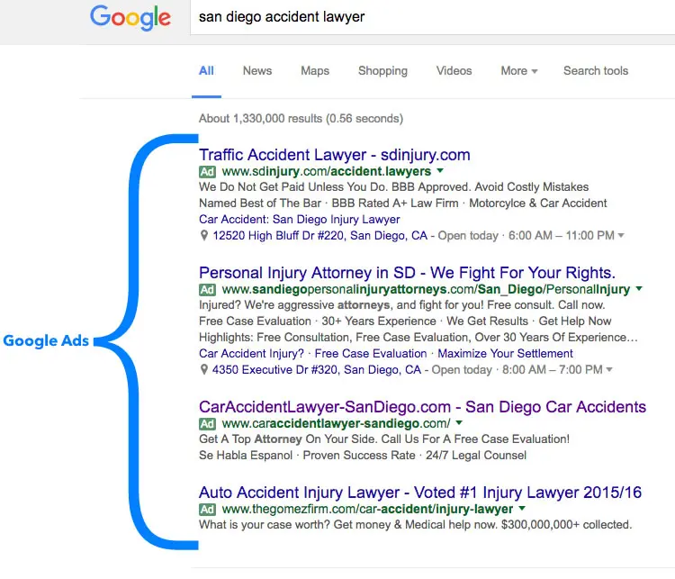 For those law firms who need to generate business right away, there is probably no better solution than marketing your law firm through a smart and efficient Google Adwords campaign. More people than ever before are clicking on paid search ads, especially since Google removed the right side ads and added another ad up top. The first 4 results on a page are now Google ads!