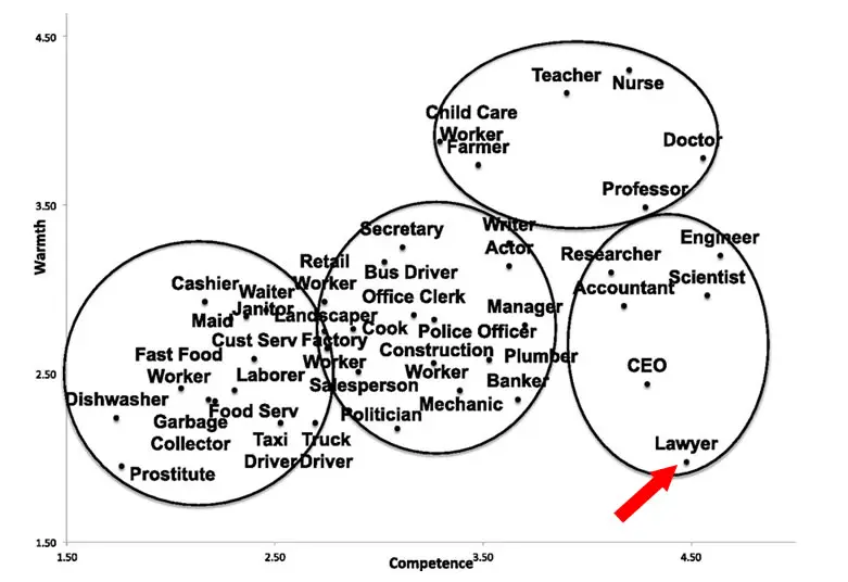A Princeton University study in 2014 polled adults on how they viewed certain professions, including lawyers, chief executive officers, engineers, accountants, scientists, and researchers. Any guess which profession rated lowest on warmth and trust? You guessed it. Lawyers.